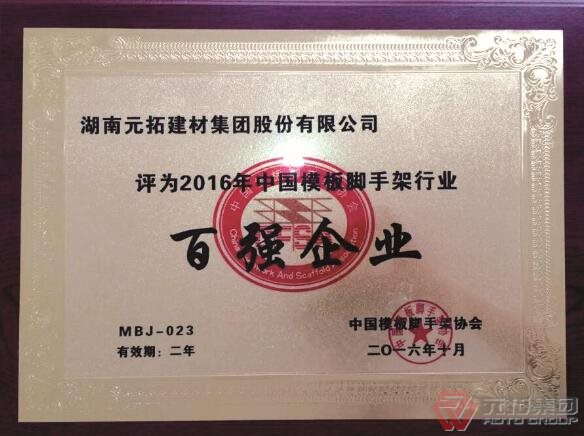 元拓被評為2016年中國模板腳手架行業(yè)百強企業(yè)